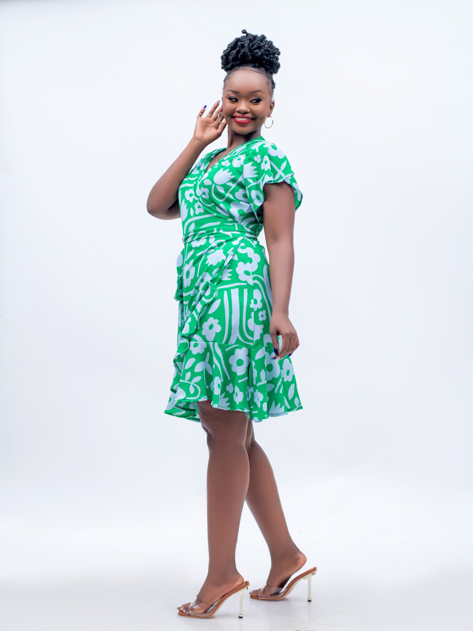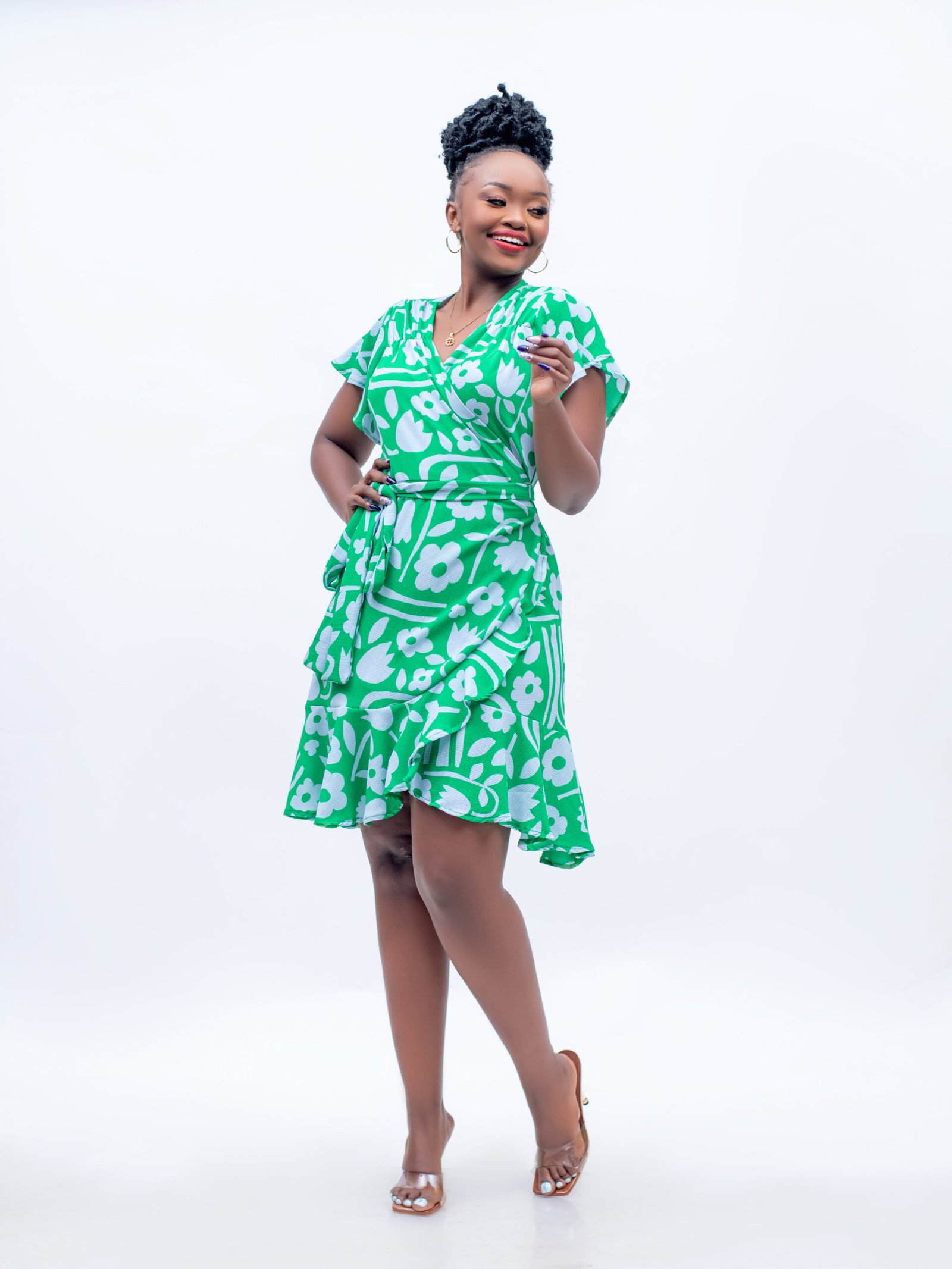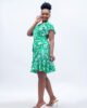 Introducing the Mini Wrap Dress in vibrant green print from Plainchic Nairobi, designed for the stylish woman who loves to make a statement. This flirty dress features a flattering wrap design that accentuates your figure, making it perfect for brunches, garden parties, or casual outings.